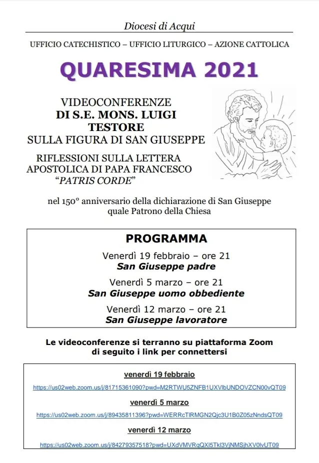 1. l’Ufficio Catechistico Diocesano, avvalendosi della preziosa collaborazione dell’Ufficio Liturgico e dell’Azione Cattolica, ha chiesto a Mons. Luigi Testore di offrire tre riflessioni sulla figura di San Giuseppe.