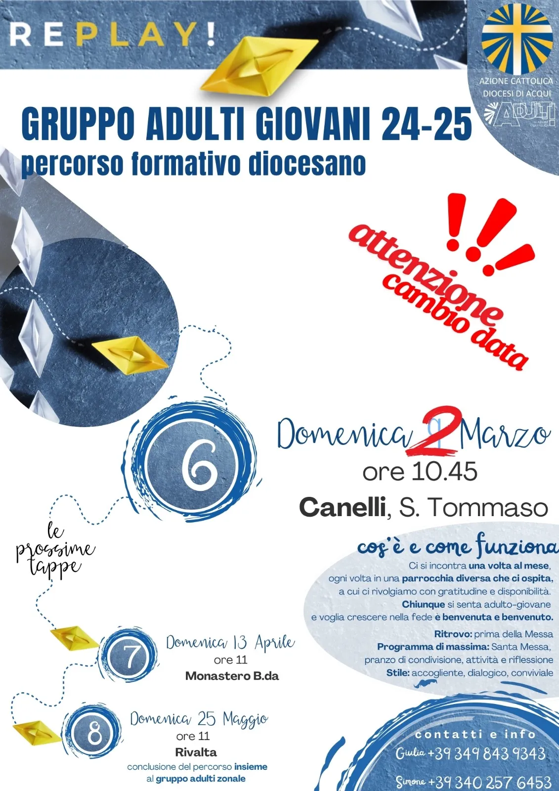 Pensato e organizzato per coinvolgere le giovani coppie, le giovani famiglie che hanno già i piedi nel mondo degli adulti, segue i temi proposti nel testo adulti che l’Azione Cattolica propone a livello nazionale.