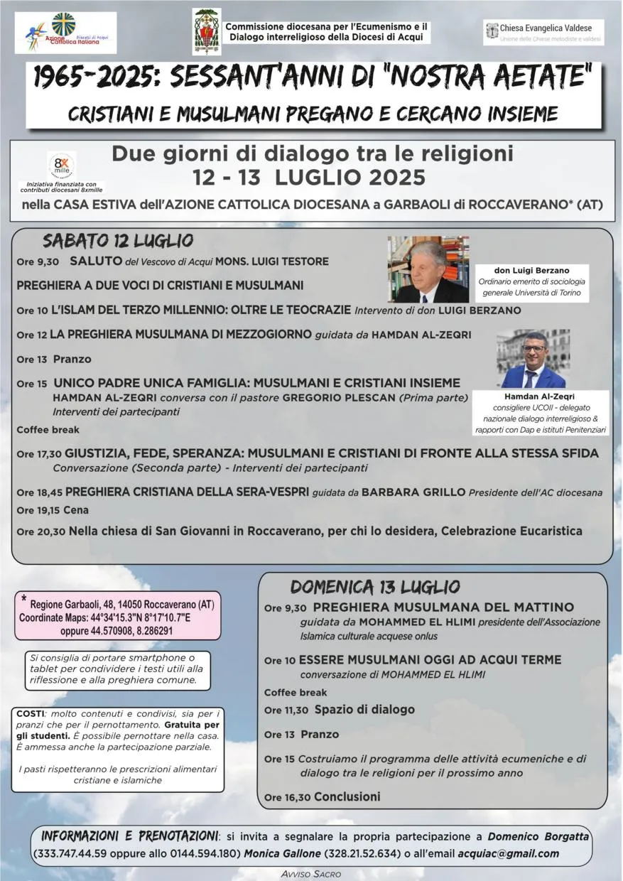 Ed è per dare il loro contributo al dialogo tra le religioni ed in particolare coi musulmani che i cristiani che vivono nel territorio della diocesi di Acqui (cattolici e protestanti insieme) propongono a tutti questa iniziativa . Fin dal titolo “1965-2025: sessant’anni di Nostra Aetate: cristiani e musulmani pregano e cercano insieme richiama la volontà di dialogo che i partecipanti sono chiamati ad esprimere attraverso le conversazioni, la discussione e la preghiera.