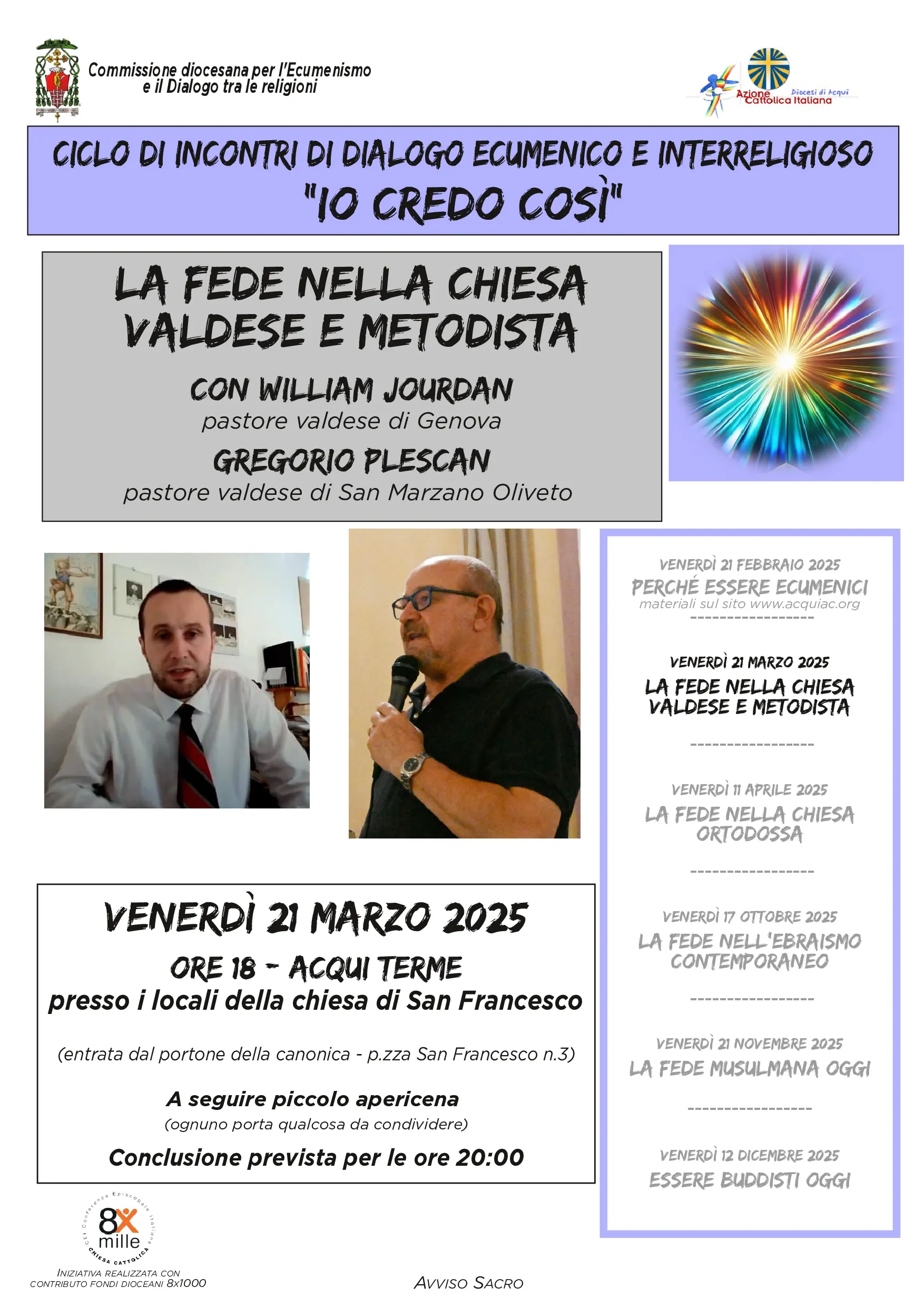 Per il ciclo di incontri per il dialogo ecumenico ed interreligioso “IO CREDO COSI'” venerdì 21 marzo 2025 alle 18 nella chiesa di San Francesco in Acqui Terme, l’incontro con i pastori William Jourdan e Gregorio Plescan, valdesi e metodisti di Genova e San Marzano Oliveto.
