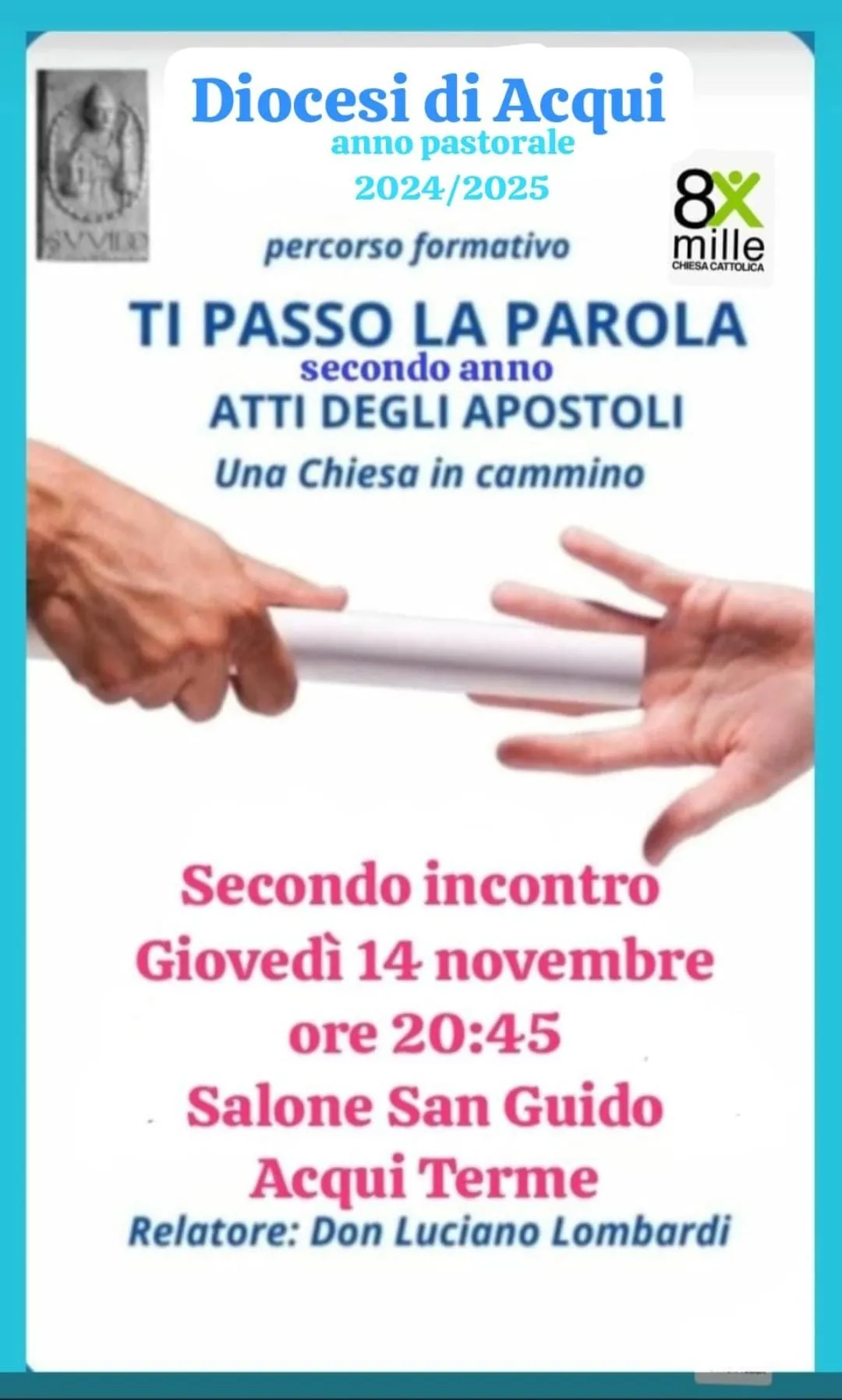 Secondo incontro per approfondire gli Atti degli Apostoli con don Lombardi in vista dell’iniziativa del secondo anno di Ti passo la Parola nelle comunità di fedeli della Diocesi di Acqui Dettaglio eventi Data: 14 Novembre 2024 20:45 – 22:30 Luogo: Salone San Guido - Acqui Categorie: Diocesi